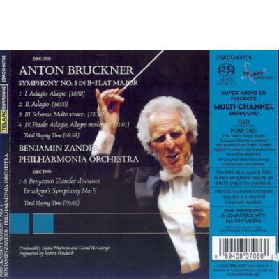 Benjamin Zander's new recording of Bruckner's Symphony No. 5 is magnificent! This conductor has made many superlative recordings of Mahler symphonies (will the series ever be completed?). Here he turns his attention to Bruckner and the result is among the finest recordings ever made of the mighty Symphony No. 5. Everything is right, pacing is perfect, and the orchestra is in top form. Recorded January 8-10, 2008 in London's Watford Coliseum, the producers were Elaine Martone and David St. George, with Robert Fredrich as engineer. They did their work to perfection. The sound is full, rich and incredibly detailed. The personnel list for the Philharmonia shows only 5 horns, 4 trumpets, 2 trombones, bass trombone and tuba, so it seems that extra brass (as used by Eugen Jochum in his Concertgebouw recording) was not used. However, as recorded here, the fantastic brass peroration at the conclusion of the final movement is thrilling. And Zander is a master teacher, evidenced by his informative discussion of the symphony, profusely illustrated with musical examples. This is a major release for serious collectors.
