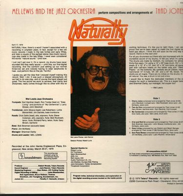 MEL LEWIS & THE JAZZ ORCHESTRA Naturally (1979 US/German-pressed 6-track audiophile vinyl LP, featuring Mel Lewis' jazz orchestra performing the compositions and arrangements of Thad Jones, mastered by Soundstream and distributed by Audio Technica. Gatefold picture sleeve with extensive liner notes).