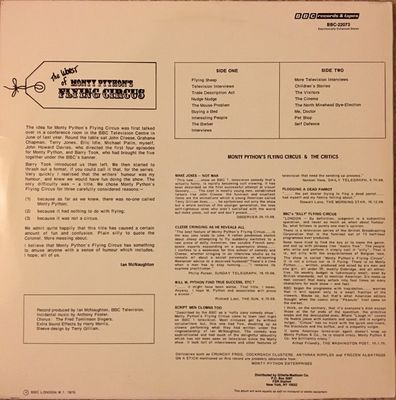 Next to the television show itself, the album was the first piece of media the Pythons released. It is noted that Terry Gilliam was not included as a member of Python on the album's cast listing (in spite of his brief appearance in the sketch "The Visitors") and Graham Chapman's name is misspelled "Grahame".